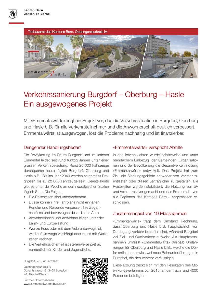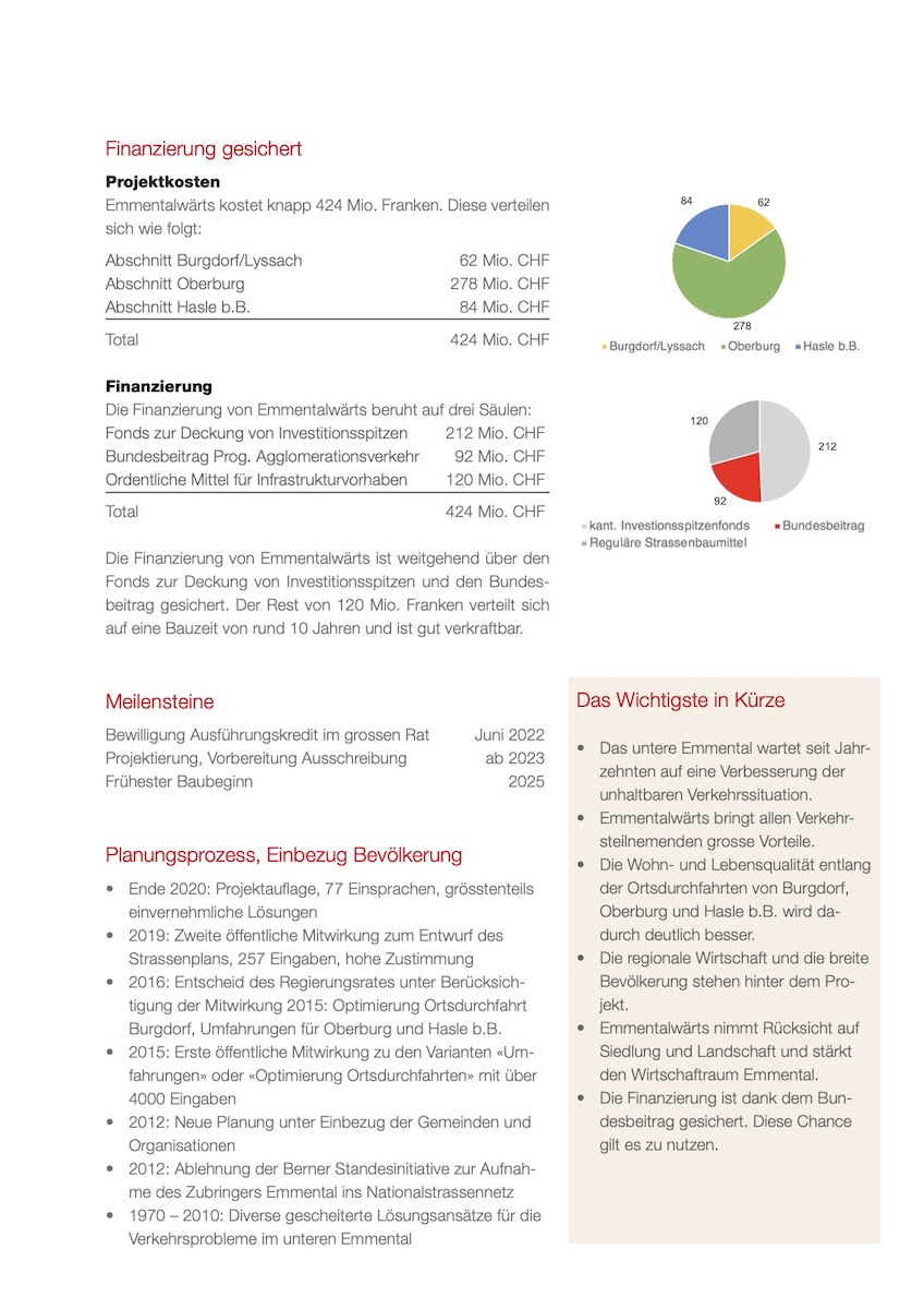 Mit «Emmentalwärts» liegt ein Gesamtprojekt vor, das die Verkehrssituation in Burgdorf, Oberburg und Hasle b.B. für alle Verkehrsteilnehmer und die Anwohnerschaft deutlich verbessert. Emmentalwärts ist ausgewogen, löst die Probleme nachhaltig und ist finanzierbar. Es benötigt keine weiteren Abklärungen oder Projektänderungen zum Projekt mehr. Die Bevölkerung hat klar signalisiert, dass sie das Problem jetzt und in der vorliegenden Form lösen möchte. Ein «Zurück zum Start» würde eine jahrzehntelange Verzögerung bedeuten – ohne Gewähr, dass dann alle mit der neuen Lösung einverstanden wären. Die bisher angefallenen Projektierungskosten für das Gesamtprojekt von CHF 16.4 Mio. müssten abgeschrieben werden.