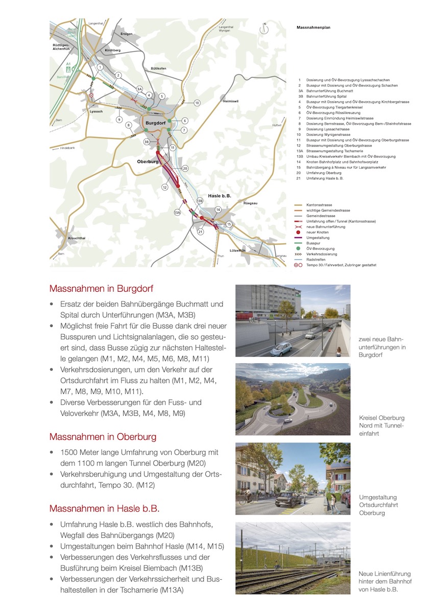 Das vorliegende Gesamtverkehrsprojekt ist Bestandteil einer breit angelegten Zweckmässigkeitsbeurteilung (ZMB 2007) und wurde in einen jahrelangen Prozess schrittweise und unter Einbezug der Bevölkerung, der Gemeinden und der Verbände entwickelt. Mit der ZMB 2007 wurde vertieft abgeklärt, mit welchen Massnahmen die verkehrlichen Probleme im Emmental, abgestimmt auf die gewünschte Siedlungsentwicklung, gelöst werden können. Einige Elemente aus dieser Gesamtbetrachtung sind bereits umgesetzt. Beispielsweise eine neue Regionalbusverbindung, der Radwegring Burgdorf und ein Doppelspurausbau der Bahn.